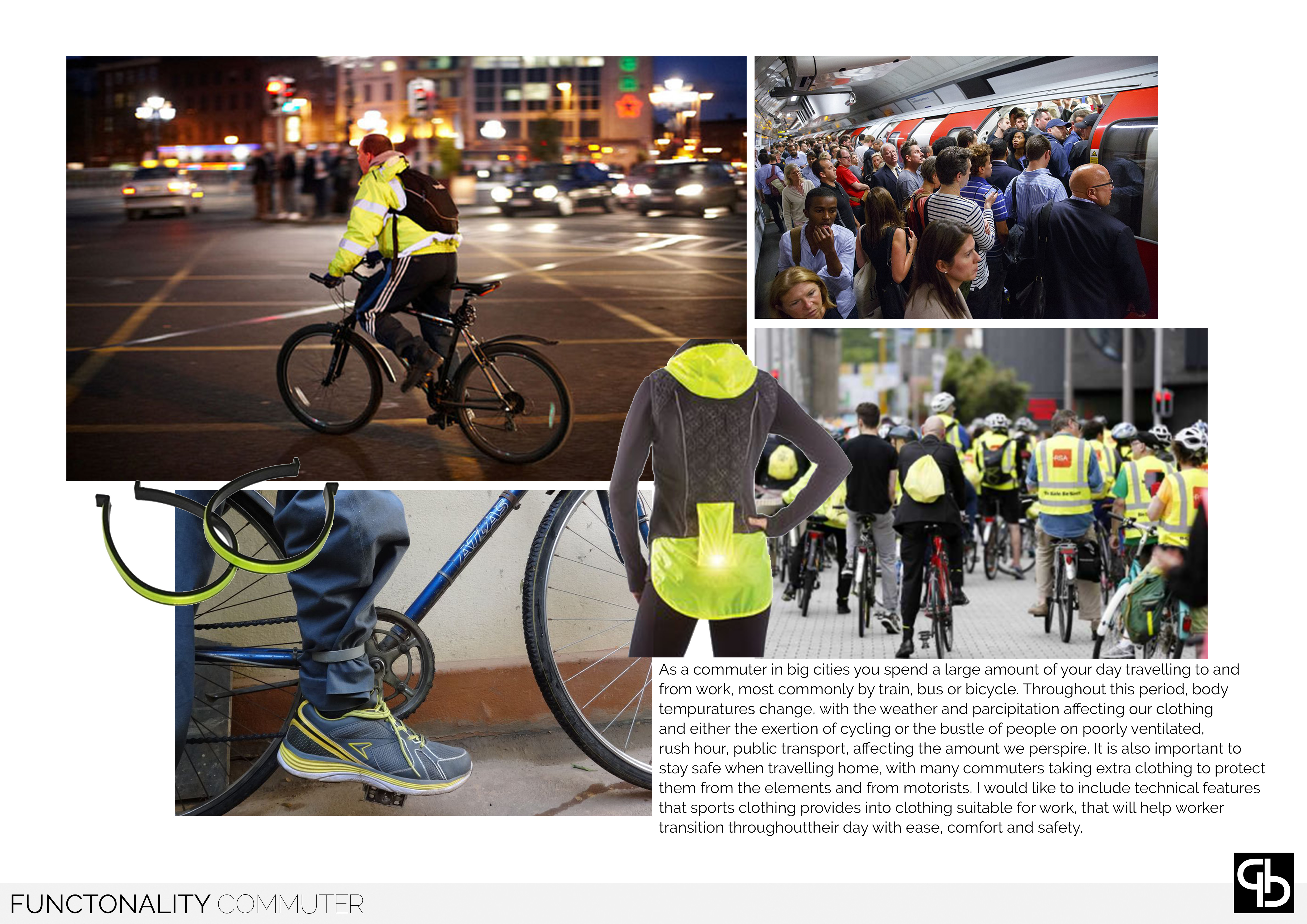 Fucntionality looks at technical textiles, drawing guidance from commuter lifestyle and incorporating the textiles to provide the wearer with garments that transition them throughout their day with ease, comfort and safety. Designing garments that can be worn to the office but also enhance your journey to and from work, reducing the need to carry different clothing and more bags.