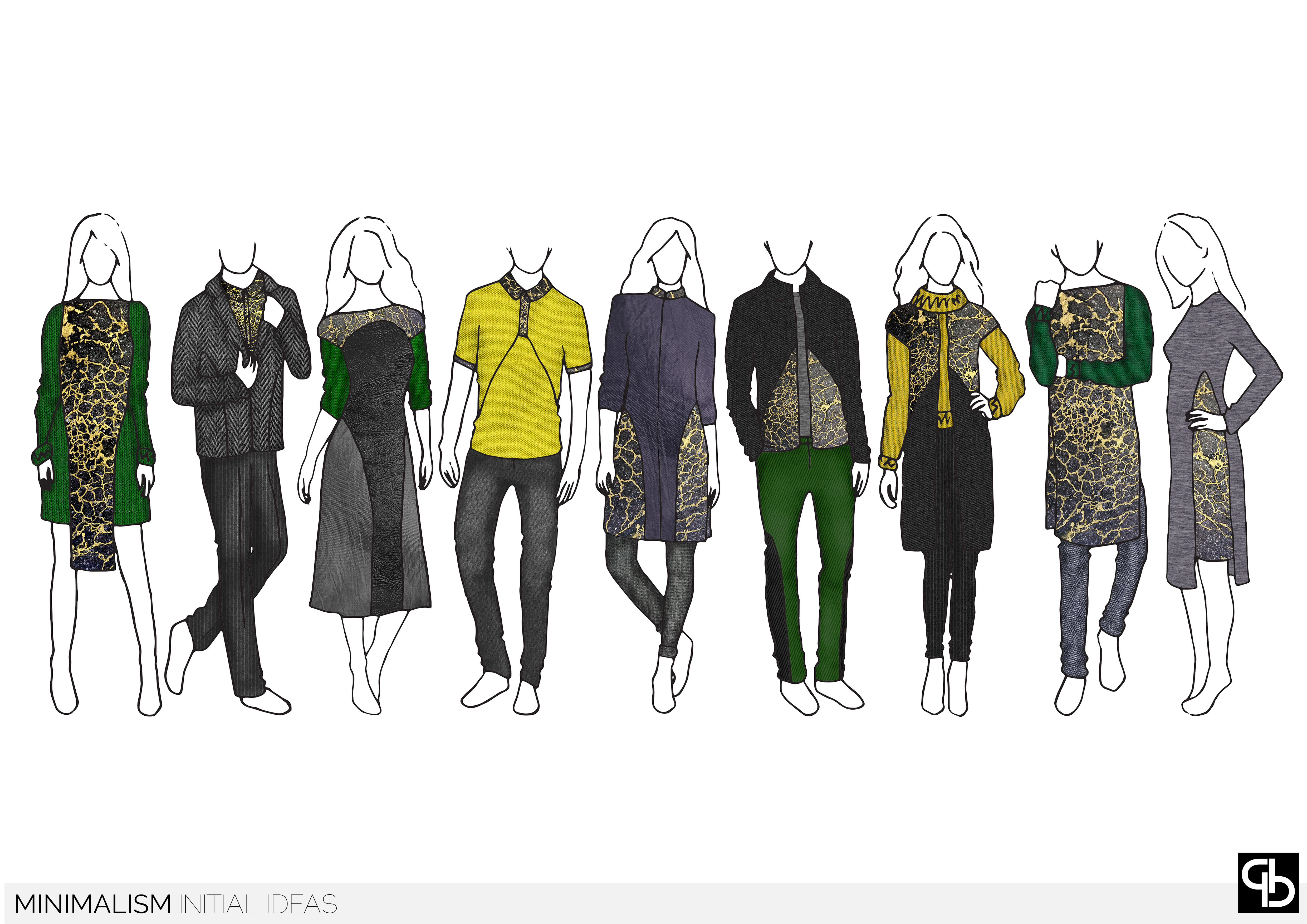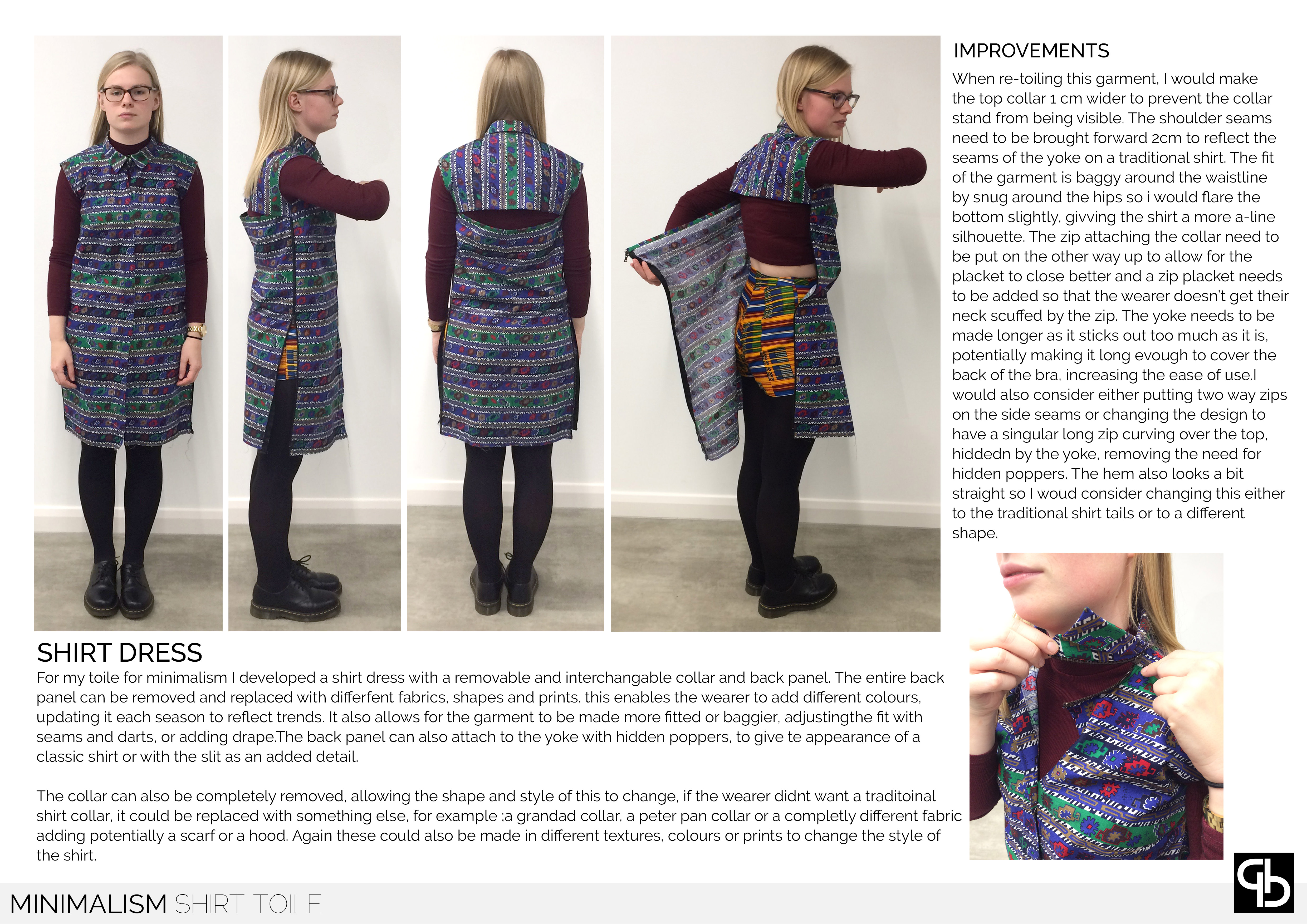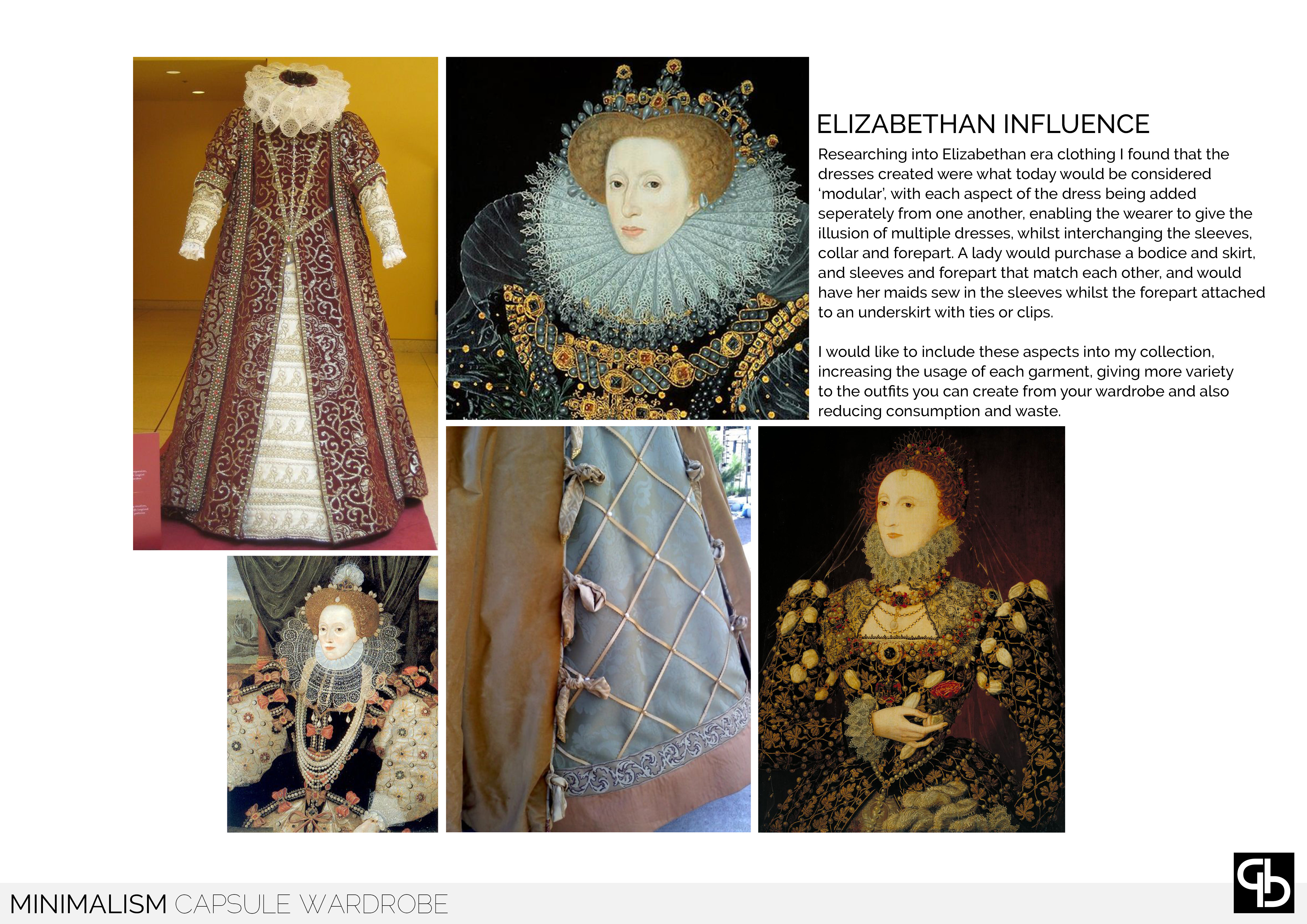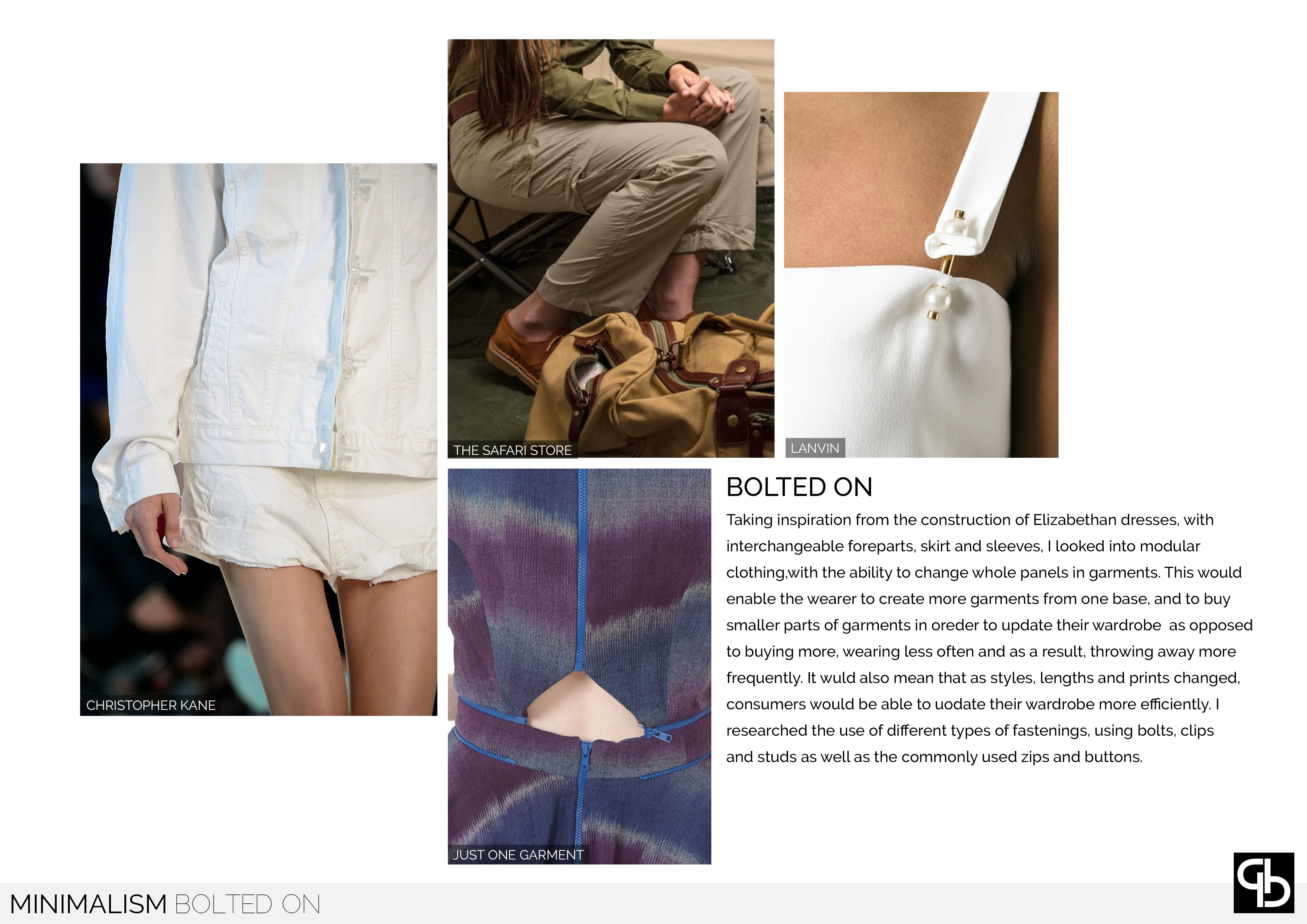 Minimalism looks at the amount of garments that people buy and the percentage of these that are commonly worn. Creating a modular collection with interchangable panels which can be replaced without the need to buy an entirely new garment, taking inspiration from the Elizabethan dresses with changable sleeves, collars and foreparts. This concept enables the consumer to change the fit and silhouette of the garments depending on their personal style.