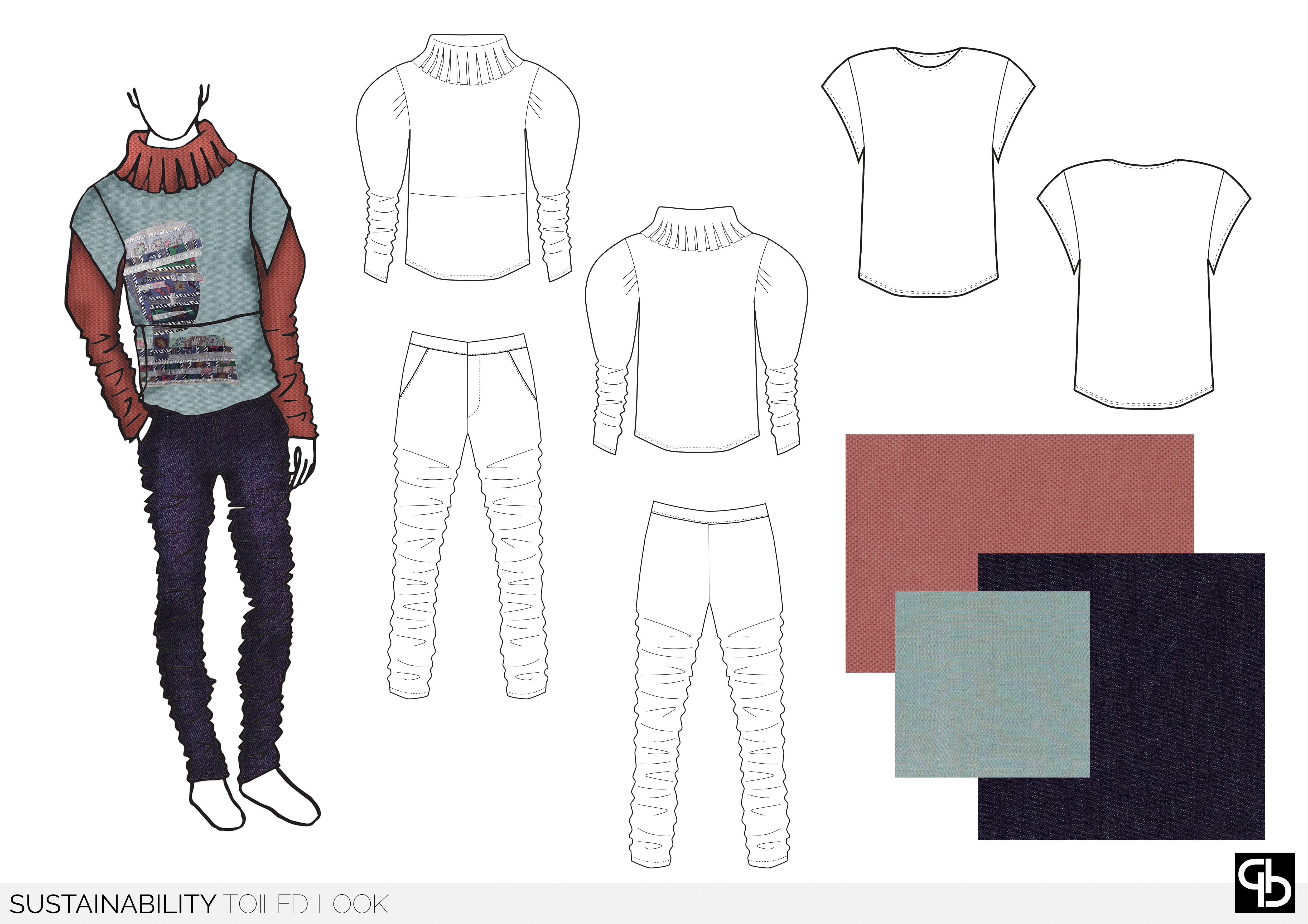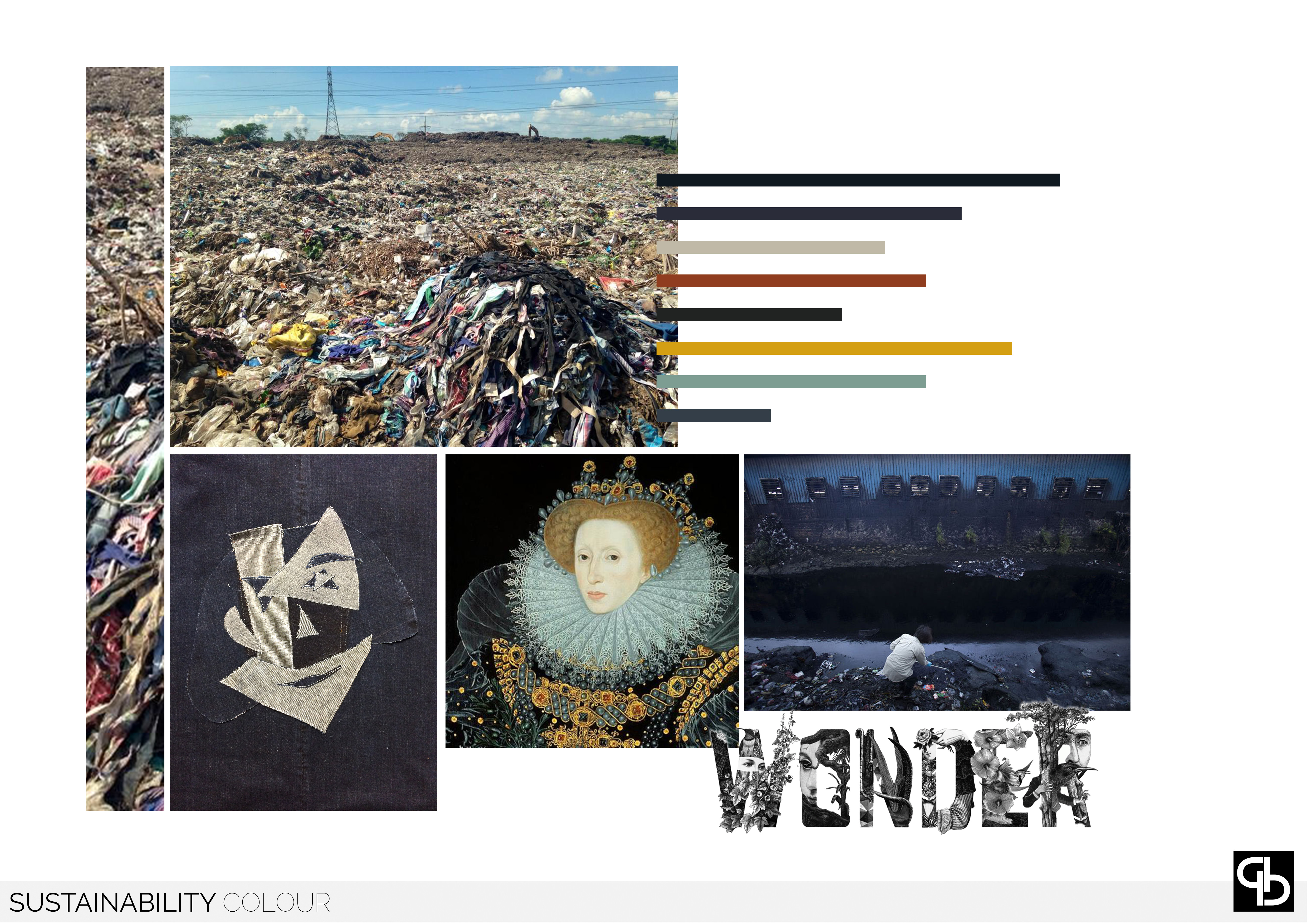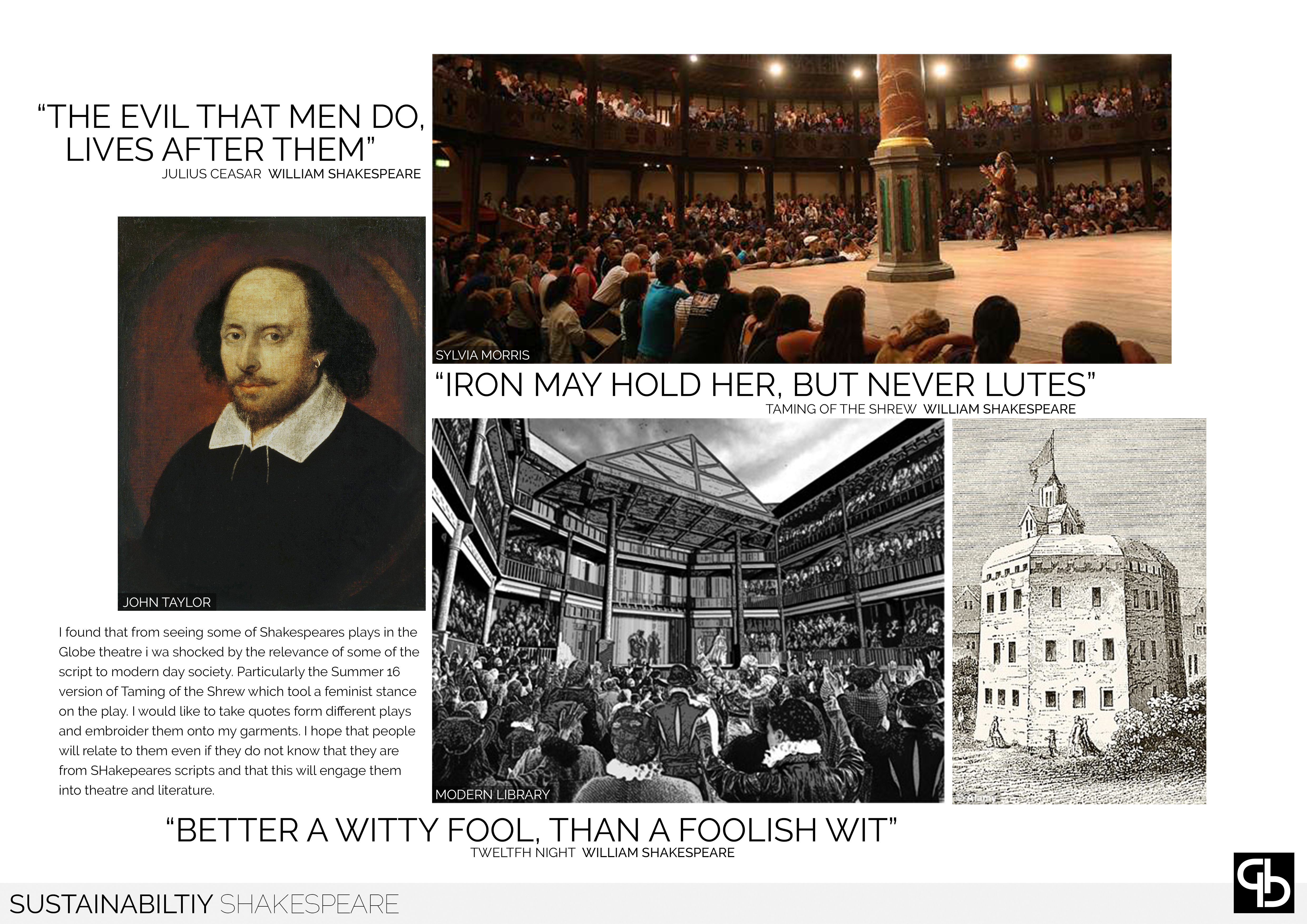 Sustainability develops using what is considered to be waste and using patchworking to reinvent it into a statement, using sharp, abstract imagery and quotes from Shakespeare's plays that resonated with current events. The asthetic of this range is derived from styles of the Elizabethan Era, shaken with a modern twist.